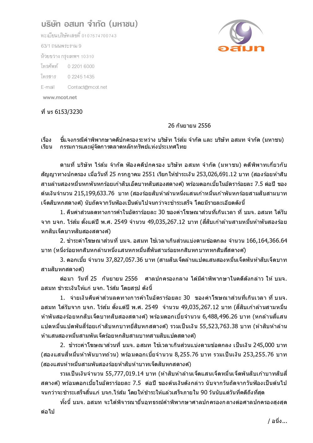 อสมท แจ้งตลท.เล็งยื่นอุทธรณ์ หลังถูกศาลสั่งจ่าย 55 ล้าน ให้บ.ไร่ส้ม