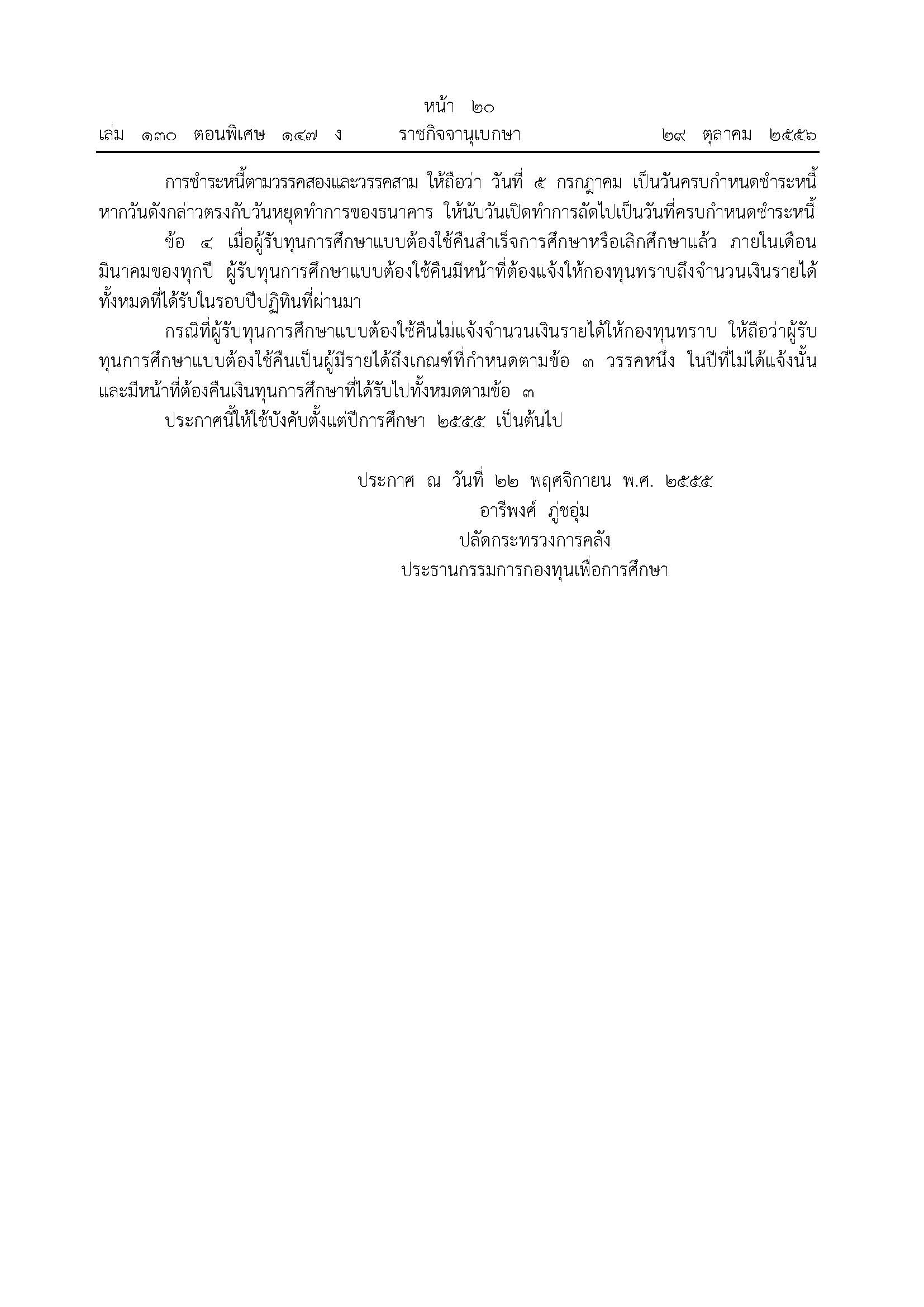 ผู้สื่อข่าวสำนักข่าวอิศรา (www.isranews.org) รายงานว่า เมื่อวันที่ 29 ตุลาคม 2556 ราชกิจจานุเบกษา ได้เผยแพร่ประกาศคณะกรรมการกองทุนเพื่อการศึกษา เรื่อง วิธีการและระยะเวลาการชำระคืนทุนการศึกษาแบบต้องใช้คืน โครงการเงินกู้เพื่อการศึกษาที่ผูกพันกับรายได้ในอนาคต (กรอ.) ปีการศึกษา 2555 โดยมีรายละเอียด ดังนี้
