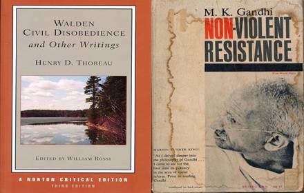มหาตมะ คานธี (1869-1948) เกิดหลัง Henry David Thoreau 52 ปี ต่อสู้กับอังกฤษเพื่อเอกราชของอินเดียด้วย"สัตยะเคราะห์" และขบวนการดื้อแพ่ง ประท้วงด้วยกิจกรรมดื้อแพ่ง ไม่ให้ร่วมมือกับรัฐบาลอาณานิคมอินเดียของอังกฤษ ที่ครอบครองอินเดียมานานกว่าสองร้อยปี จนประสพชัยชนะในที่สุด ทำให้อินเดียได้รับเอกราชในปี 1947 แต่มหาตมะ คานธี เองกลับต้องภัยความรุนแรง โดยถูกยิงตายในปี 1948