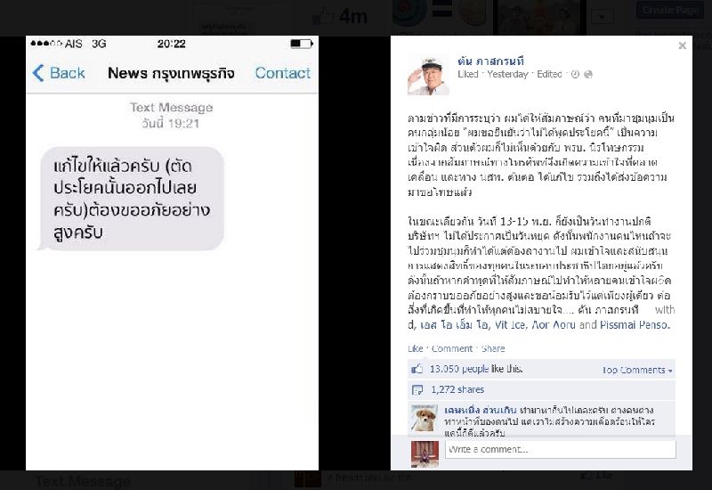ผู้สื่อข่าวรายงานว่า เมื่อวันที่ 12 พฤศจิกายน นายตัน ได้โพสต์ข้อความ ผ่านทางเฟซบุ๊ก "ตัน ภาสกรนที" ชี้แจงถึงกรณีดังกล่าว ระบุข้อความว่า