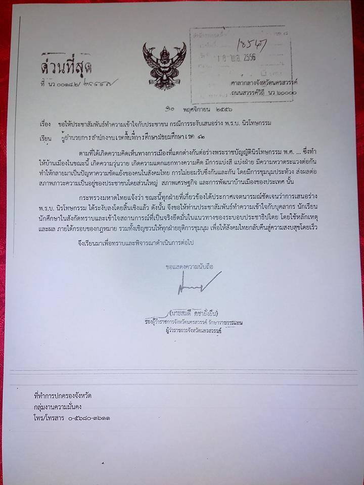 โดยระบุว่าเป็นหนังสือตีตราประทับคำว่า "ด่วนที่สุด" ลงวันที่ 10 พฤศจิกายน 2556 ปรากฎชื่อ นายสมดี คชายั่งยืน รองผู้ว่าราชการจังหวัดนครสวรรค์ รักษาราชการแทนผู้ว่าราชการจังหวัดนครสวรรค์ เป็นผู้ลงนาม