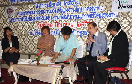 วันที่ 21 มิ.ย. 54 ที่โรงแรมรัตนโกสินทร์ คณะกรรมการสมานฉันท์แรงงานไทย (คสรท.) และภาคีเครือข่าย จัดเวทีสมัชชาแรงงานไทย “จุดยืนและข้อเสนอต่อนโยบายแรงงานของพรรคการเมืองในการเลือกตั้ง 2554” โดยเชิญตัวแทนพรรคการเมือง ประกอบด้วยพรรคประชาธิปัตย์, เพื่อไทย, การเมืองใหม่, ชาติไทยพัฒนา, ภูมิใจไทย และพรรครักประเทศไทยเข้าร่วม
