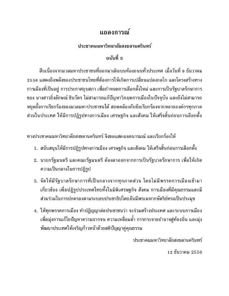 แถลงการณ์ของประชาคมชาวมหาวิทยาลัยสงขลานครินทร์ หาดใหญ่