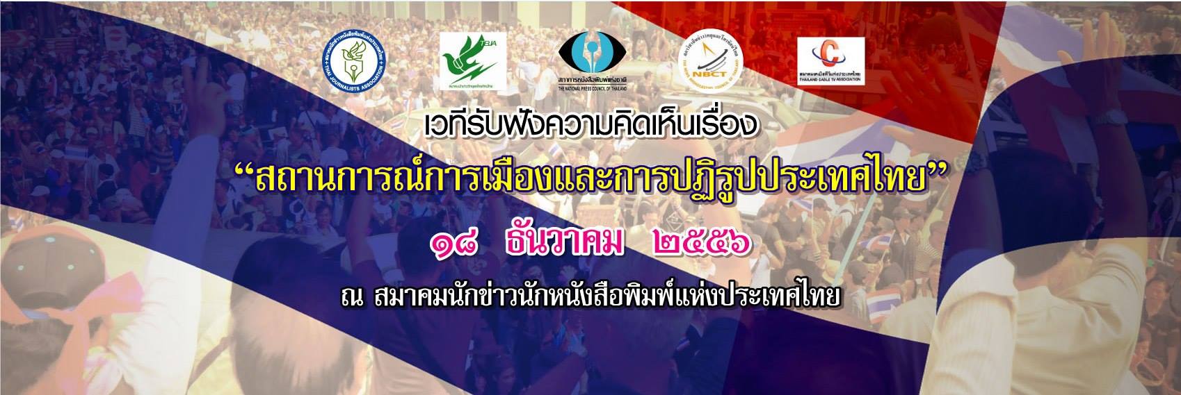 นายปราเมศ เหล็กเพ็ชร์ เลขาธิการ สมาคมนักข่าวนักหนังสือพิมพ์แห่งประเทศไทย เปิดเผยว่า สมาคมนักข่าวนักหนังสือพิมพ์แห่งประเทศไทย ร่วมกับสมาคมนักข่าววิทยุและโทรทัศน์ไทย สภาการหนังสือพิมพ์แห่งชาติ สภาวิชาชีพข่าววิทยุและโทรทัศน์ไทย และสมาคมเคเบิลทีวีแห่งประเทศไทย จะจัดเวทีรับฟังความคิดเห็นเรื่อง “สถานการณ์การเมืองและการปฏิรูปประเทศไทย” ในวันพุธที่ 18 ธันวาคม 2556 เวลา 10.00 น. ณ ห้องอิศรา อมันตกุล สมาคมนักข่าวนักหนังสือพิมพ์แห่งประเทศ ถนนสามเสน โดยมีผู้เข้าร่วมประชุมในระดับบรรณาธิการ หรือผู้ช่วยบรรณาธิการ จากหนังสือพิมพ์และวิทยุกระจายเสียงและวิทยุโทรทัศน์ โดยมีประเด็นในการหารือ 2 ประเด็น คือ 1.สถานการณ์วิกฤตของประเทศไทย และ 2. รับฟังความคิดเห็นจากบรรณาธิการสื่อต่างๆ ว่าองค์กรวิชาชีพควรจะมีจุดยืนหรือท่าทีต่อสถานการณ์ของประเทศอย่างไร