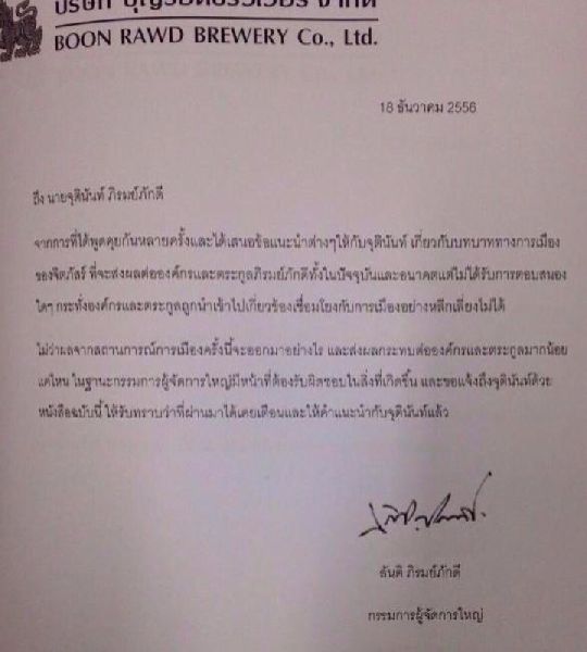ก่อนหน้านี้เมื่อวันที่ 18 ธ.ค. 2556 ได้มีเอกสารเผยแพร่ทางสื่อออนไลน์จากนายสันติ ภิรมย์ภักดี กรรมการผู้จัดการใหญ่ บริษัท บุญรอดบริวเวอรี่ จำกัด ถึงนายจุตินันท์ ภิรมย์ภักดี บิดาของ น.ส.จิตภัสร์ ภิรมย์ภักดี หรือ ตั๊น อดีตผู้สมัครสมาชิกสภาผู้แทนราษฎรพรรคประชาธิปัตย์ และ คณะกรรมการประชาชนเพื่อการเปลี่ยนแปลงประเทศไทยให้เป็นประชาธิปไตยที่สมบูรณ์อันมีพระมหากษัตริย์เป็นประมุข (กปปส.)โดยเนื้อหากล่าวตำหนินายจุตินันท์ ต่อกรณีบทบาททางการเมืองของ น.ส.จิตภัสร์ ซึ่งส่งผลกระทบต่อธุรกิจและตระกูล