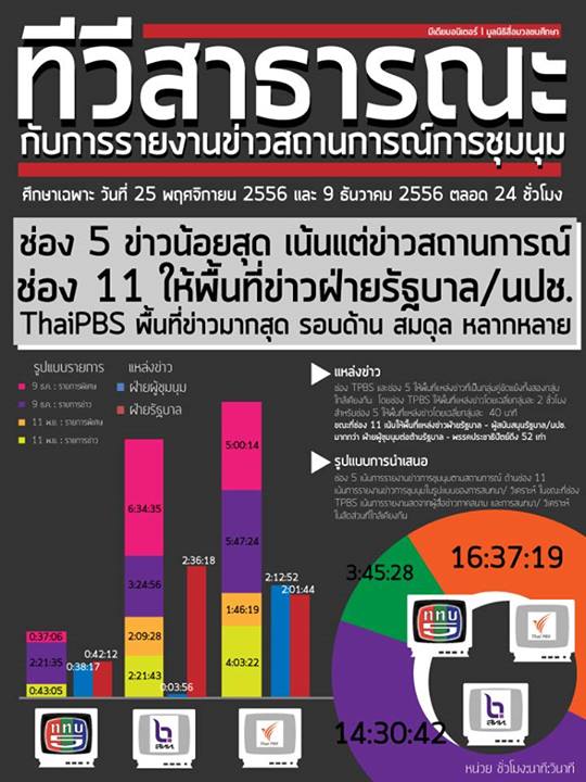 วันที่ 20 ธันวาคม มีเดียมอนิเตอร์ ได้เผยแพร่ผลการศึกษาการรายงานสถานการณ์การชุมนุมใหญ่ในวันที่ 25 พฤศจิกายน และวันที่ 9 ธันวาคม 2556 ระหว่างช่วงเวลา 00.00-24.00 น. ของฟรีทีวีประเภทบริการสาธารณะทั้ง 3 ช่อง ได้แก่ ช่อง ททบ. 5 สทท. 11 และ ช่อง TPBS
