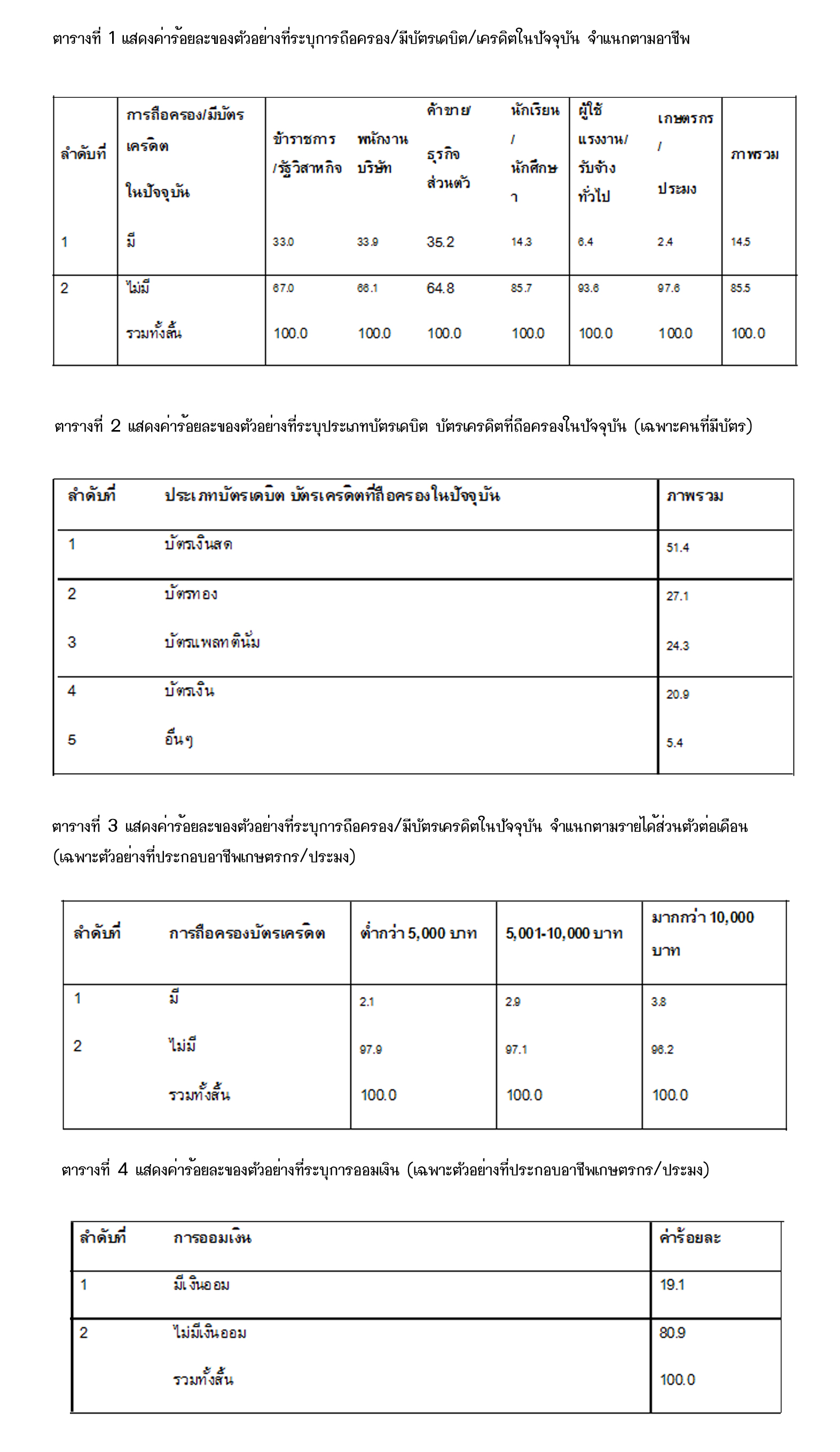 ในขณะเดียวกัน เมื่อจำแนกตามรายได้ส่วนตัวเฉพาะตัวอย่างที่ประกอบอาชีพเกษตรกร/ประมงนั้น พบว่า ตัวอย่างที่มีรายได้ต่ำกว่า 5,000 บาท และระหว่าง 5,001-10,000 บาท มีสัดส่วนการถือครองบัตรเครดิตใกล้เคียงกัน คือร้อยละ 2.1 และ 2.9 ตามลำดับ ในขณะที่ ตัวอย่างที่มีรายได้มากกว่า 10,000 บาท มีสัดส่วนการถือครองบัตรเครดิตมากกว่า หรือคิดเป็นร้อยละ 3.8 เมื่อถามถึงประเภทบัตรเครดิตที่มีในปัจจุบัน พบว่า ตัวอย่างครึ่งหนึ่งหรือร้อยละ 51.4 มีบัตรเงินสด ร้อยละ 27.1 มีบัตรทอง ร้อยละ 24.3 มีบัตรแพลทตินั่ม และร้อยละ 20.9 มีบัตรเงิน