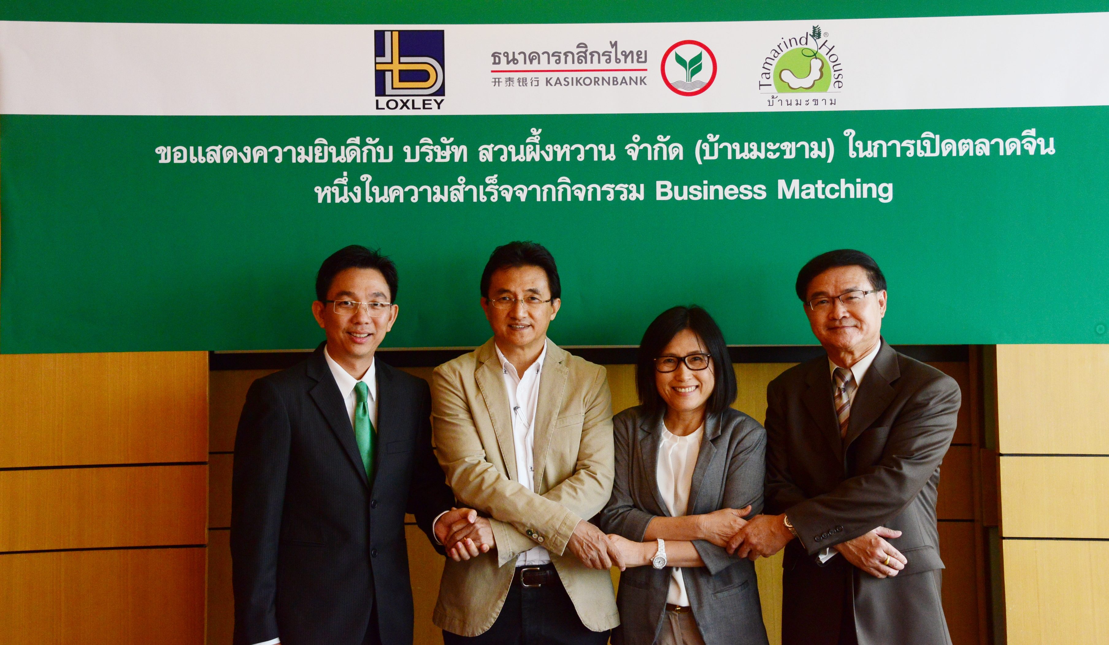 นายพิภวัตว์ ภัทรนาวิก (ซ้าย) ผู้ช่วยกรรมการผู้จัดการ ธนาคารกสิกรไทย ร่วมฉลองความสำเร็จกับ นายสุรพันธ์ ภาษิตนิรันดร์ (ขวา) กรรมการรองกรรมการผู้จัดการใหญ่ บริษัท ล็อกซ์เล่ย์ จำกัด และนายนิวัฒน์ โฆวงศ์ประเสริฐ (ที่2 จากซ้าย) กรรมการผู้จัดการ บริษัท สวนผึ้งหวาน จำกัด ลูกค้าโครงการ Business Matching ซึ่งเป็นโครงการที่สนับสนุนและเพิ่มโอกาสให้ลูกค้าในการหาช่องทางตลาดใหม่ๆ ผ่านการจับคู่ธุรกิจกับพันธมิตรของธนาคาร ซึ่งบ้านมะขาม (Tamarind House) ประสบความสำเร็จนำสินค้าผลิตภัณฑ์จากมะขามไปจำหน่ายในสถานีบริการน้ำมันเครือไซโนเปค (Sinopec) ซึ่งเป็นบริษัทน้ำมันรายใหญ่ของสาธารณรัฐประชาชนจีน พร้อมเตรียมขยายตลาดไปยังประเทศในกลุ่ม AEC ณ ธนาคารกสิกรไทย สำนักงานใหญ่ ราษฎร์บูรณะ เมื่อเร็วๆ นี้