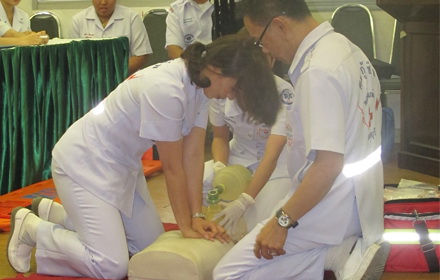 “ขั้นตอนแรกของการช่วยฟื้นคืนชีพหรือการทำ CPR คือการกดนวดหัวใจ จัดให้ผู้ป่วยนอนหงายบนพื้นแข็งโดยผู้ช่วยเหลือนั่งคุกเข่าอยู่ทางด้านข้างของผู้ป่วย วางส้นมือลงไปตามแนวกึ่งกลางของหน้าอกหรือกึ่งกลางระหว่างหัวนมทั้งสองข้างของผู้ป่วยแล้วนำมืออีกข้างมาประกบ ประสานนิ้วและทำการล๊อกนิ้ว กระดกข้อมือขึ้นลง โดยให้สันมือสัมผัสกับหน้าอกเท่านั้น โน้มตัวมาให้แนวแขนตั้งฉากกับหน้าอกของผู้ป่วย แขนตรงและดึง ออกแรงกดลงไปโดยใช้แรงจากหัวไหล่ จุดหมุนอยู่ตรงสะโพก กดให้หน้าอกยุบลงไปอย่างน้อย 5 เซนติเมตร โดยให้สันมือสัมผัสกับหน้าอกผู้ป่วย ตลอดการนวดหัวใจ สันมือจะต้องไม่หลุดออกจากหน้าอกผู้ป่วยด้วยความเร็ว100 ครั้งต่อหน้าที หรืออัตราความเร็วตามจังหวัดเพลง ‘สุขกันเถอะเรา’ หรือเพลง ‘จังหวะหัวใจ’ ” ผู้อำนวยการสำนักจัดระบบการแพทย์ฉุกเฉิน สพฉ. กล่าวในที่สุด .