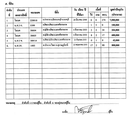 4. ล่าสุดกรณีพ้นจากตำแหน่ง รมช.เกษตรฯ ครบ 1 ปี วันที่ 27 ต.ค. 2556 (ยื่นต่อ ป.ป.ช. 9 ธ.ค. 2556) ระบุว่า ถือครองที่ดิน 7 แปลง (แปลงใหม่ที่เพิ่มขึ้นมา อยู่ใน ต.ทุ่งใส อ.สิชล จ.นครศรีธรรมราช เนื้อที่ 3-0-59.8/10 แต่ไม่ได้ระบุราคา)