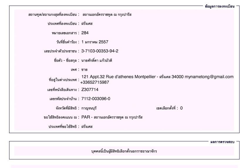 จากนั้น เมื่อวันที่ 2 มกราคม 2556 “ศักดา แก้วบัวดีน” ได้โพสต์เอกสารแสดงการใช้สิทธิเลือกตั้งนอกราชอาณาจักร ที่ลงทะเบียนไว้กับ สถานเอกอัครราชทูตฝรั่งเศส จากพื้นที่ใช้สิทธิเดิม ในจังหวัดกาญจนบุรี พร้อมระบุข้อความว่า “ข้าพเจ้าได้ทำหน้าที่ของคนไทยนอกราชอาณาจักร สำเร็จไปขั้นหนึ่งแล้ว”