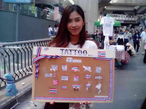 “พวกเราเริ่มกิจกรรมขายแทททูตั้งแต่เริ่มมีชัตดาวน์วันแรกในวันที่ 13 มกราคม ถึงวันนี้ก็ขายมาได้ 3 วันแล้ว วันแรกๆไปขายที่ชิดลม แต่ว่าขายไม่ค่อยดี เลยย้ายมาที่สยาม ที่นี่คนค่อนข้างเยอะ สำหรับแบบของแทททูพวกเราจะออกแบบเองทั้งหมด และเราขายพร้อมติดให้ฟรีลายละ 20บาท ส่วนเวลาเปิดร้านก็ตั้งแต่ 11.00-18.00 น.”