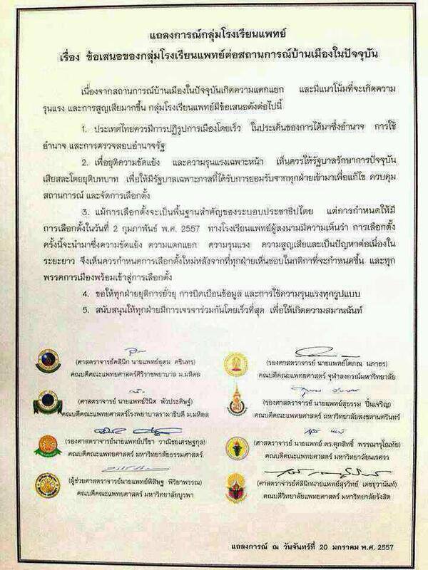 3.แม้การเลือกตั้งจะเป็นพื้นฐานสำคัญของระบอบประชาธิปไตย แต่การกำหนดให้มีการเลือกตั้งในวันที่ 2 กุมภาพันธ์ พ.ศ.2557 ทางโรงเรียนแพทย์ผู้ลงนามมีความเห็นว่า การเลือกตั้งครั้งนี้นำมาซึ่งความขัดแย้ง ความแตกแยก ความรุนแรง ความสูญเสียและเป็นปัญหาต่อเนื่องในระยะยาว จึงเห็นควรกำหนดการเลือกตั้งใหม่หลังจากที่ทุกฝ่ายเห็นชอบในกติกาที่จะกำหนดขึ้น และทุกพรรคการเมืองพร้อมเข้าสู่การเลือกตั้ง