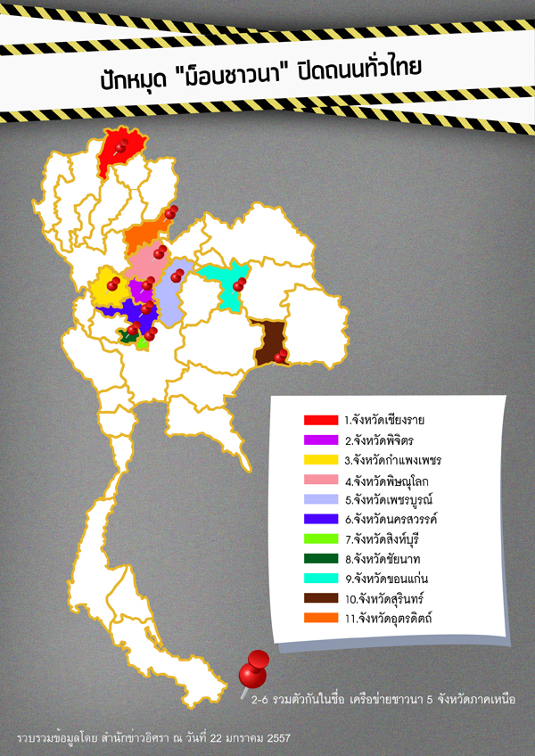 วันที่ 22 มกราคม 2557 กลุ่มชาวนา 5 จังหวัด ปิดถนนสายเอเชีย กม. 68-69 (หน้ารพ.พรหมบุรี) ต.พรหมบุรี อ.พรหมบุรี จ.สิงห์บุรี เรียกร้องให้จ่ายเงินโครงการรับจำนำข้าว กลุ่มชาวนาใน จ.อ่างทอง รวมตัวกันที่ศาลากลางจังหวัด เพื่อเข้าพบผู้ว่าราชการจังหวัด โดยยื่นหนังสือผ่านไปยังรัฐบาล เรียกร้องให้จ่ายเงินโครงการรับจำนำข้าว หลังมีชาวนาในพื้นที่ยังไม่ได้รับเงินอีกกว่า 600 ล้านบาท แกนนำชาวนา ยืนยันจะเดินทางไปร่วมชุมนุม กับชาวนา 5 จังหวัดที่รวมตัวกันปิดถนนสายเอเชีย ในพื้นที่ อ.พรหมบุรี จ.สิงห์บุรี