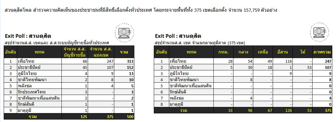 ขณะที่องค์การกระจายเสียงและแพร่ภาพสาธารณะแห่งประเทศไทย (Thai PBS)รายงานผลเอ็กซิทโพล ของสวนดุสิตโพล