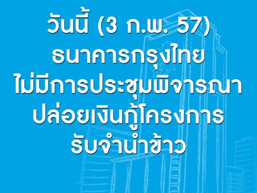 วันที่ 3 กุมภาพันธ์ ธนาคารกรุงไทย ออกข่าวชี้แจงว่า ธนาคารฯ ไม่มีการประชุมพิจารณาปล่อยเงินกู้โครงการจำนำข้าว ตามที่เกิดกระแสข่าวแต่อย่างใด