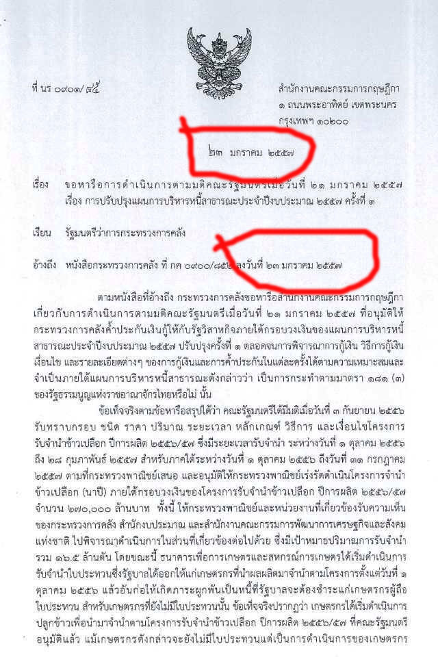 สำนักข่าวอิศรา www.isranews.org ตรวจสอบหนังสือสำนักงานคณะกรรมการกฤษฎีกา ที่ นร. 0901/ 85 ลงวันที่ 23 มกราคม 2557 ที่ทำถึง รัฐมนตรีว่ากระทรวงการคลัง เรื่องการขอหารือตามมติคณะรัฐมนตรี เมื่อวันที่ 21 มกราคม 2557 เรื่องการปรับปรุงแผนการบริหารหนี้สาธารณะประจำปีงบประมาณ 2557 ครั้งที่ 1 ซึ่งมีสาระสำคัญเกี่ยวกับการจัดหาแหล่งเงินทุนเพื่อนำไปใช้ในการดำเนินการโครงการรับจำนำข้าว