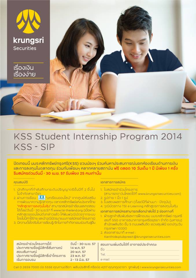 บมจ.หลักทรัพย์กรุงศรี (KSS) จัดโครงการการอบรมให้ความรู้เรื่องหุ้นอย่างเป็นระบบ สำหรับนักศึกษาในมหาวิทยาลัย ฟรี 10 วันเต็ม เริ่มรับสมัครตั้งแต่วันนี้ - 30 เม.ย.57 เริ่มอบรม 2-13 มิ.ย.57