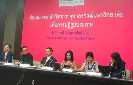 วันที่ 25 กุมภาพันธ์ 2557 จุฬาลงกรณ์มหาวิทยาลัย จัดแถลงข่าว ‘ข้อเสนอจากนักวิชาการจุฬาฯ เพื่อการปฏิรูปประเทศ’ ใน 5 เรื่อง ได้แก่ การทุจริตคอร์รัปชั่นในมิติเศรษฐศาสตร์, การจำนำข้าว, การปฏิรูปพลังงาน, สถานการณ์ความรุนแรง และการสื่อสารที่สร้างความเกลียดชัง ณ อาคารจามจุรี 4 จุฬาลงกรณ์มหาวิทยาลัย โดยมีนพ.ภิรมย์ กมลรัตนกุล อธิการบดีจุฬาฯ กล่าวเปิดงาน