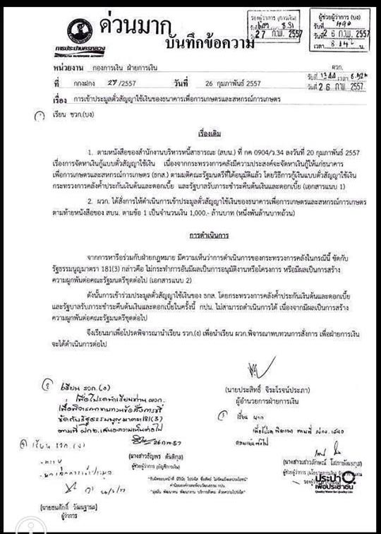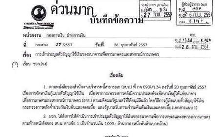 หลังจากสำนักงานบริหารหนี้สาธารณะ (สบน.)ที่ กค.0904/ว.34 ลงวันที่ 20 กุมภาพันธ์ 2557 เรื่องการจัดหาเงินกู้แบบตั๋วสัญญาใช้เงิน เนื่องจากกระทรวงการคลังมีความประสงค์จะจัดหาเงินกู้ให้ธนาคารเพื่อการเกษตรและสหกรณ์การเกษตร (ธ.ก.ส.) ตามมติคณะรัฐมนตรีที่ได้อนุมัติแล้ว โดยวิธีการกู้เงินแบบตั๋วสัญญาใช้เงิน กระทรวงการคลังค้ำประกันเงินต้น และดอกเบี้ย และรัฐบาลรับภาระการชำระคืนต้นเงิน และดอกเบี้ย