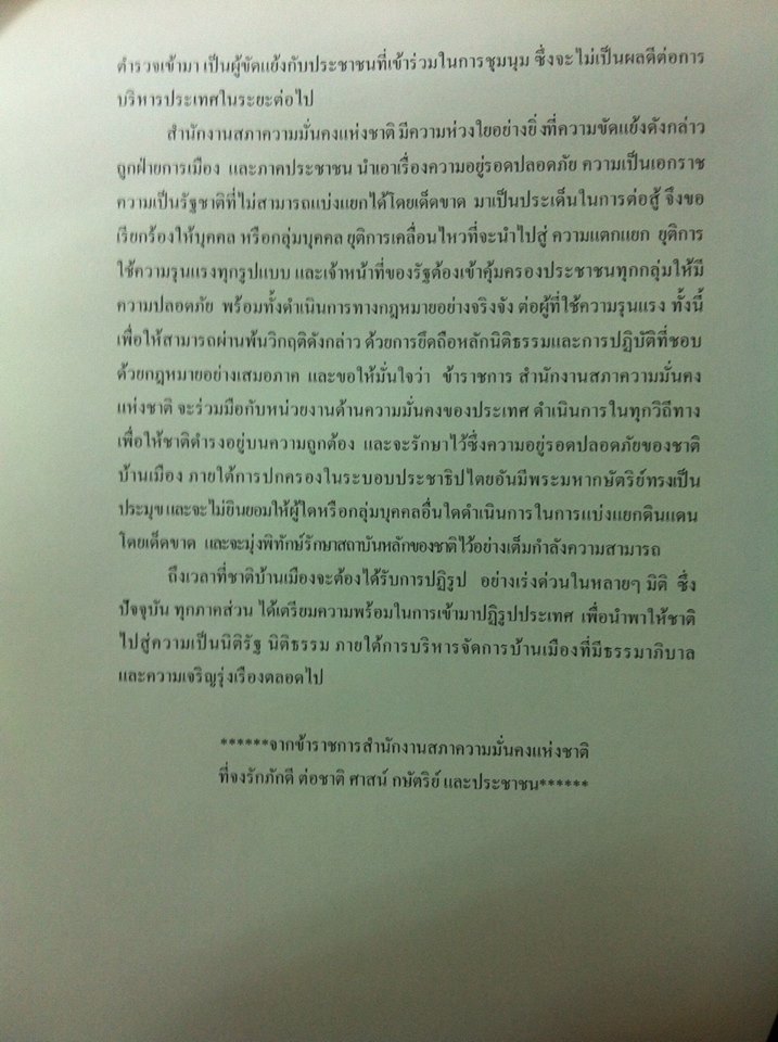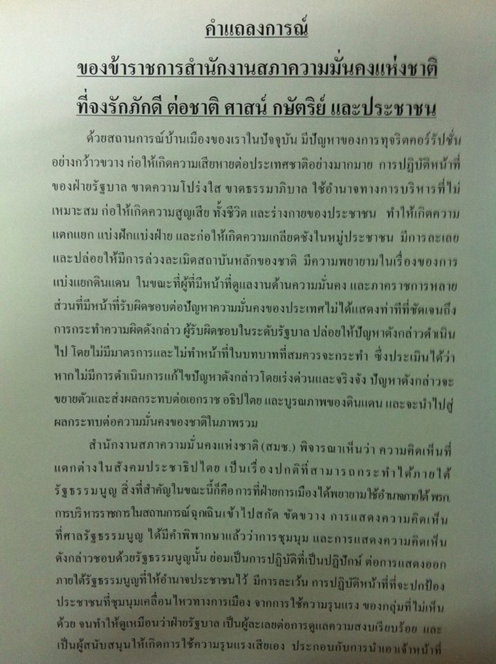 “สมช. มีความห่วงใยอย่างยิ่งที่ความขัดแย้งดังกล่าวถูกฝ่ายการเมือง และภาคประชาชน นำเอาเรื่องความอยู่รอดปลอดภัย ความเป็นเอกราช ความเป็นรัฐชาติที่ไม่สามารถแบ่งแยกได้โดยเด็ดขาด มาเป็นประเด็นในการต่อสู้ จึงขอเรียกร้องให้บุคคล หรือกลุ่มบุคคล ยุติความเคลื่อนไหวที่จะนำไปสู่ความแตกแยก ยุติการใช้ความรุนแรงทุกรูปแบบ และเจ้าหน้าที่ของรัฐต้องเข้าคุ้มครองประชาชนทุกกลุ่มให้มีความปลอดภัย พร้อมทั้งดำเนินการทางกฎหมายอย่างจริงจังต่อผู้ใช้ความรุนแรง” แถลงการณ์ดังกล่าว ระบุ