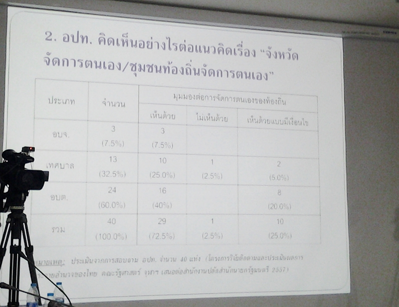 งานวิจัยชิ้นนี้จะเสร็จสิ้นสมบูรณ์กลางปี 2557 แต่มีข้อมูลเบื้องต้นที่ได้สะท้อนทิศทางที่สนับสนุน โดยพบว่า ส่วนใหญ่กลุ่มท้องถิ่น 72.5% เห็นด้วยกับเรื่องจังหวัดจัดการตนเองให้มีอำนาจบริหารจัดการมากขึ้น