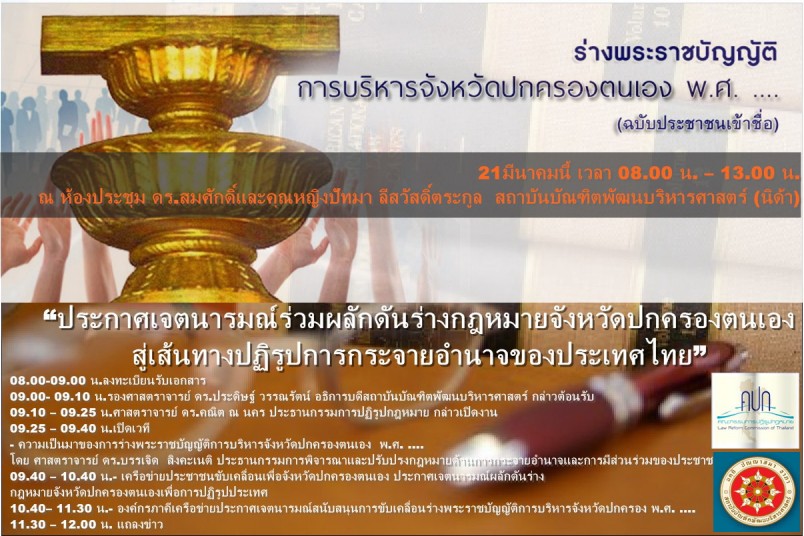 คณะกรรมการพิจารณาปรับปรุงและพัฒนากฎหมายด้านการกระจายอำนาจและการมีส่วนร่วมของประชาชน ในคณะกรรมการปฏิรูปกฎหมาย ซึ่งมีหน้าที่สำคัญประการหนึ่งในการให้คำปรึกษาและสนับสนุนการดำเนินการร่างกฎหมายของประชาชนผู้มีสิทธิเลือกตั้ง เห็นควรดำเนินการช่วยเหลือสนับสนุนภาคประชาชนในการผลักดันขับเคลื่อนร่างกฎหมายว่าด้วยการบริหารจังหวัดปกครองตนเอง จึงกำหนดจัด “การเสวนาและประกาศเจตนารมณ์สนับสนุนร่างกฎหมายจังหวัดปกครองตนเองเพื่อการปฏิรูปประเทศ” ในวันศุกร์ที่ 21 มีนาคม2557 ณ สถาบันบัณฑิตพัฒนบริหารศาสตร์ (นิด้า)