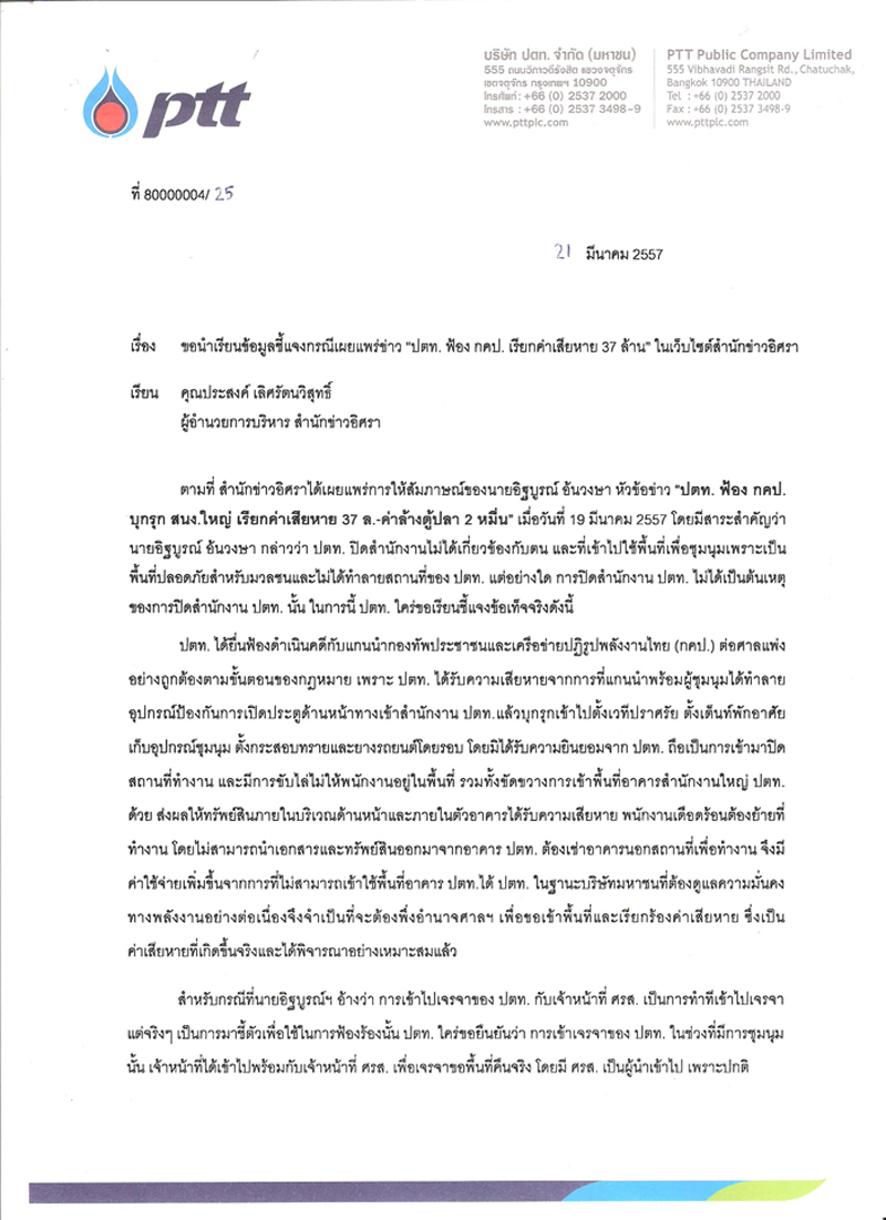ตามที่ สำนักข่าวอิศราได้เผยแพร่การให้สัมภาษณ์ของนายอิฐบูรณ์ อ้นวงษา หัวข้อข่าว“ปตท. ฟ้อง กคป. บุกรุก สนง.ใหญ่ เรียกค่าเสียหาย 37 ล.-ค่าล้างตู้ปลา 2 หมื่น” เมื่อวันที่ 19 มีนาคม 2557 โดยมีสาระสำคัญว่า นายอิฐบูรณ์อ้นวงษากล่าวว่า ปตท. ปิดสำนักงานไม่ได้เกี่ยวข้องกับตน และที่เข้าไปใช้พื้นที่เพื่อชุมนุมเพราะเป็นพื้นที่ปลอดภัยสำหรับมวลชนและไม่ได้ทำลายสถานที่ของ ปตท. แต่อย่างใด การปิดสำนักงาน ปตท. ไม่ได้เป็นต้นเหตุของการปิดสำนักงาน ปตท. นั้น ในการนี้ ปตท. ใคร่ขอเรียนชี้แจงข้อเท็จจริงดังนี้