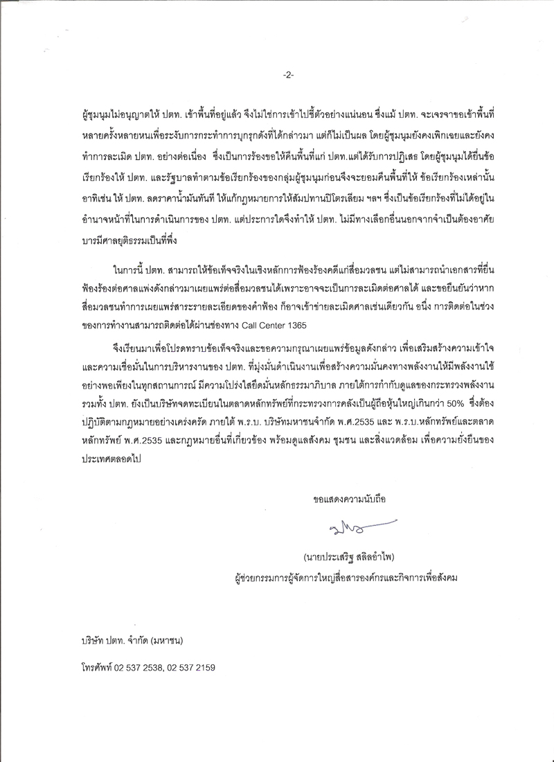 ในการนี้ ปตท. สามารถให้ข้อเท็จจริงในเชิงหลักการฟ้องร้องคดีแก่สื่อมวลชน แต่ไม่สามารถนำเอกสารที่ยื่นฟ้องร้องต่อศาลแพ่งดังกล่าวมาเผยแพร่ต่อสื่อมวลชนได้เพราะอาจจะเป็นการละเมิดต่อศาลได้ และขอยืนยันว่าหากสื่อมวลชนทำการเผยแพร่สาระรายละเอียดของคำฟ้อง ก็อาจเข้าข่ายละเมิดศาลเช่นเดียวกัน อนึ่ง การติดต่อในช่วงของการทำงานสามารถติดต่อได้ผ่านช่องทาง Call Center 1365