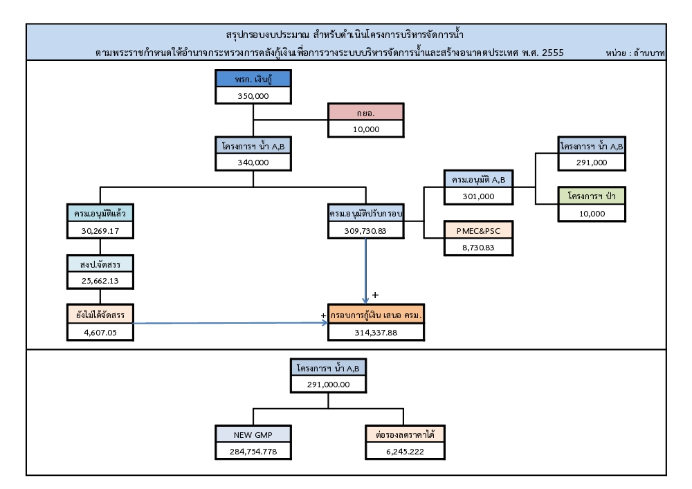 จากข้อมูลกรมบัญชี สำนักงบประมาณ ซึ่งประมาณการโดยสำนักงานเศรษฐกิจการคลัง (สศค.) สรุปความคืบหน้าการใช้จ่ายงบในโครงการบริหารจัดการน้ำ 3.5 แสนล้านบาท ขณะนี้มีการใช้วงเงินไปแล้วทั้งสิ้นกว่า 2 หมื่นล้านบาท โดยปีงบประมาณ 2556 ใช้เงินไปแล้ว 1.3 หมื่นล้านบาท และในปี 2557 เบิกไปแล้วบางส่วน 6 พันกว่าล้านบาทนั้น
