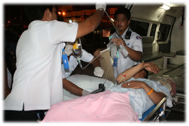 4 เจ้าหน้าที่ช่วยกันลำเลียงทหารพรานที่ได้รับบาดเจ็บจากเหตุระเบิดที่ ต.บาลอ อ.รามัน จ.ยะลา ส่งโรงพยาบาลศูนย์ยะลา (ภาพทั้งหมดโดย อะหมัด รามันห์สิริวงศ์)