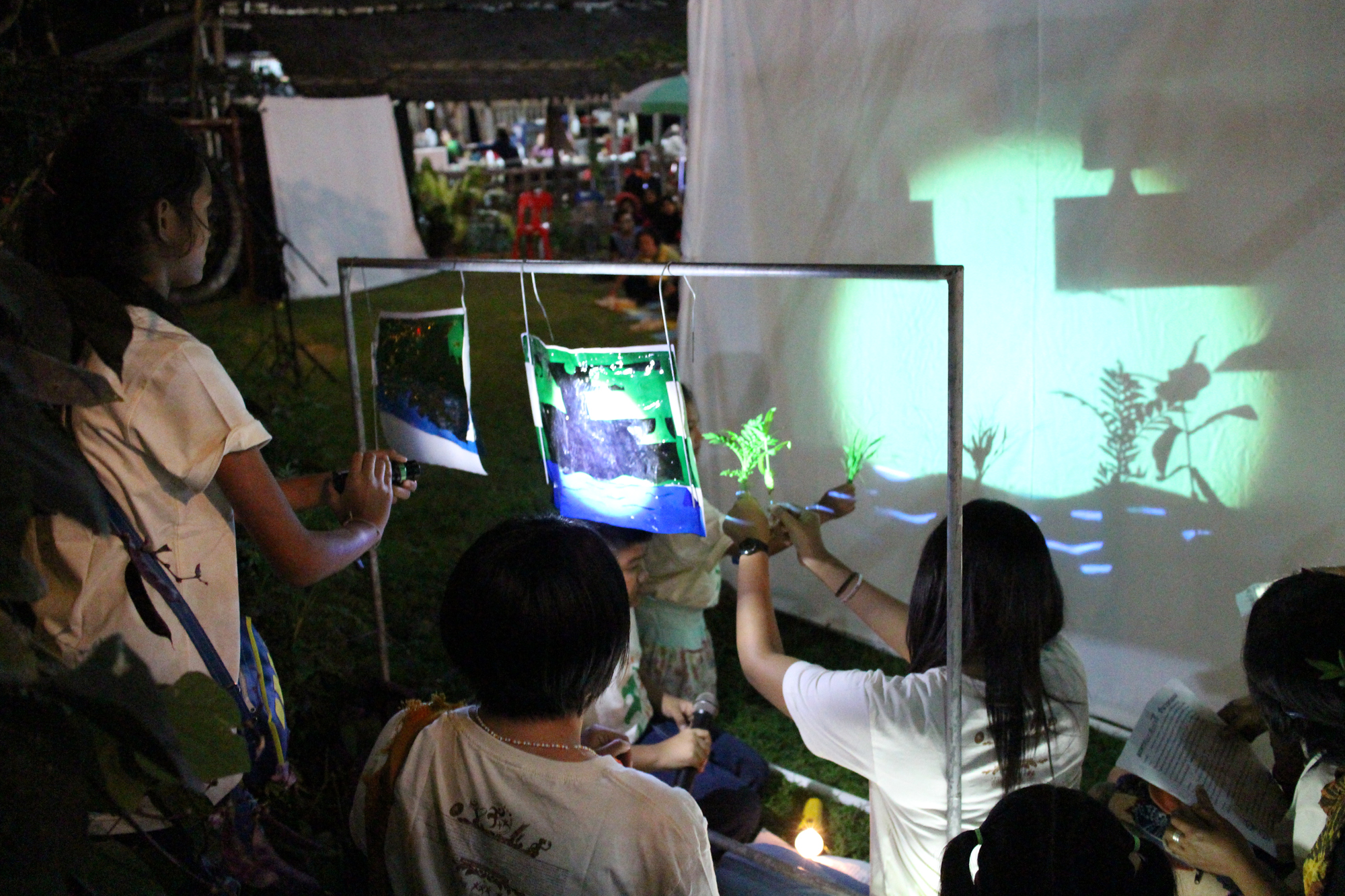 และเพื่อเป็นการเสริมความรู้ให้กับเด็กๆ ป้าป้อมจึงได้ชวน “กลุ่มมานีมานะ”กลุ่มนักทำกิจกรรมที่ใช้กระบวนการละครเพื่อพัฒนาเด็กและเยาวชนผ่านศิลปะเชิงสร้างสรรค์ ด้วยหลักสูตรหุ่นเงาให้กับเด็กๆ ได้เข้ามาทำความรู้จักกับโลกแห่งเงา ด้วยการจินตนาการตัวเองให้กลายร่างเป็นรูปเงาของสัตว์ชนิดต่างๆ บนฉากสีขาว หรือการจับเงาของแต่ละคนประทับลงบนกระดาษ อย่างอิสระพร้อมเติมสีสันลงไปจนกลายเป็นภาพที่สวยงาม ก่อนเข้าสู่กระบวนการคิดเรื่องและการสร้างหุ่นเงาขึ้นมา หุ่นเงาที่สร้างสรรค์โดยเด็กๆ เริ่มออกแสดงเรื่องแรกในชื่อตอนว่า “บ้านคลองกระอาน” เป็นเรื่องราวของเต่าที่เคยมีอยู่จำนวนมาก ณ บ้านคลองกระอาน ตำบลนาปะขอ จังหวัดพัทลุง ในเนื้อเรื่องชาวบ้านได้พูดคุยกันว่าจะจัดการอย่างไรกับเต่า ฝ่ายพ่อค้าบอกว่าจะนำเต่าไปขายชาวบ้านก็อนุญาต ฝ่ายชาวบ้านเองก็นำไข่เต่าไปกิน เมื่อเวลาผ่านไปเต่ายิ่งจะสูญพันธุ์ ครอบครัวเต่าจึงออกมาประท้วงว่า จับเราทำไม? ท่านจะบอกลูกหลานอย่างไรว่าไม่มีเต่า? ชาวบ้านจึงคิดได้ว่าเราต้องอนุรักษ์เต่าแล้วล่ะ แล้วจะทำอย่างไรให้เกิดการอนุรักษ์ฟื้นฟู...
