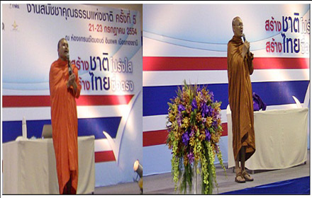 วันที่ 21 กรกรกฎาคม ในงานสมัชชาคุณธรรมแห่งชาติ ครั้งที่ 5 ปี 2554 ที่จัดโดย 20 เครือข่ายสมัชชาคุณธรรม ประกอบด้วยหน่วยงานองค์กรอิสระภาคเอกชน เครือข่ายด้านคุณธรรมจริยธรรม ภาคประชาชนและหน่วยงานภาครัฐ มีการจัดกิจกรรมเวทีย่อย เทศนาธรรม หัวข้อ “สร้างชาติโปร่งใส สร้างไทยซื่อตรง” โดย พระราชญาณกวี ผู้ช่วยเจ้าอาวาส วัดพระรามเก้ากาญจนาภิเษก และพระมหาสมปอง ตาลปุตโต วัดสร้อยทอง