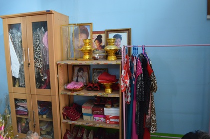 ขณะที่บริเวณรอบ ๆ เต็มไปด้วยภาพถ่ายในอดีตของหล่อนให้หวนคิดถึงความทรงจำครั้งก่อนเก่า อีกทั้งยังมีโต๊ะเครื่องแป้ง เสื้อผ้า รองเท้าส้นสูง ซึ่งส่วนใหญ่จะเป็นสีแดงตามที่หล่อนชอบตั้งเรียงรายไว้ คาดว่าอาจจะเป็นของไหว้แก้บนจากบรรดาแฟนเพลง แต่ต้องขอบอกว่าหากใครต้องการจะขอพรจะต้องจุดธูป 9 ดอก ซึ่งทางวัดได้จัดเตรียมไว้ในกราบไหว้กันด้านนอกแล้ว