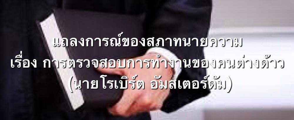 นายโรเบิร์ต อัมสเตอร์ดัม ได้ทำงานในฐานะเป็นทั้งทนายความของพันตำรวจโททักษิณ ชินวัตร และเป็นล็อบบี้ยิสต์ในส่วนของการต่อสู้คดีคือการให้ความเห็นกฎหมายระหว่างประเทศแก่พันตำรวจโททักษิณ ชินวัตร มาโดยตลอด และเป็นที่ทราบกันดีโดยทั่วไป ซึ่งสภาทนายความเห็นว่า การที่นายโรเบิร์ต อัมสเตอร์ดัม อาจหาญมาให้ความเห็นด้านการเมืองและทางกฎหมายในประเทศไทยนั้น นายโรเบิร์ต อัมสเตอร์ดัม เองซึ่งเป็นนักกฎหมายต้องรู้ดีว่าแต่ละประเทศมีกฎหมายต่างกัน โดยเฉพาะในเรื่องกฎหมายความมั่นคง สภาทนายความจึงขอแถลงการณ์มาเพื่อให้เจ้าหน้าที่ผู้มีหน้าที่ปฏิบัติดำเนินการ และให้ประชาชนทั้งหลายเข้าใจหน้าที่ของทนายความที่ดี การปฏิบัติตนตามกฎหมายภายในของประเทศนั้นมีลักษณะที่ถูกต้องอย่างไร ดังนี้