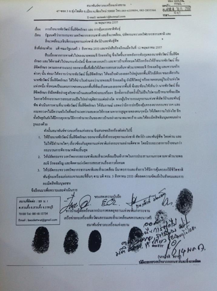 ผู้สื่อข่าวสำนักข่าวอิศรา (www.isranews.org) รายงานว่า วันที่ 14 พฤษภาคม 2557 สมาพันธ์ชาวกะเหรี่ยงแห่งสยาม ได้ยื่นหนังสือถึงรัฐมนตรีว่าการกระทรวงทรัพยากรธรรมชาติและสิ่งแวดล้อม ปลัดกระทรวงทรัพยากรธรรมชาติและสิ่งแวดล้อม และอธิบดีกรมอุทยานแห่งชาติ สัตว์ป่า และพันธุ์พืช เรื่อง การย้ายนายชัยวัฒน์ ลิ้มลิขิตอักษร และการคุ้มครองชาติพันธุ์ มีรายละเอียด ดังนี้