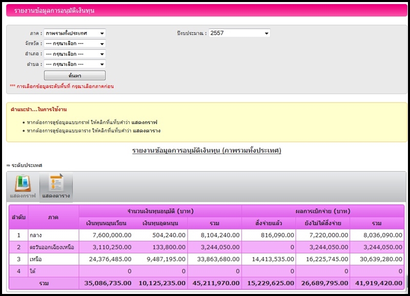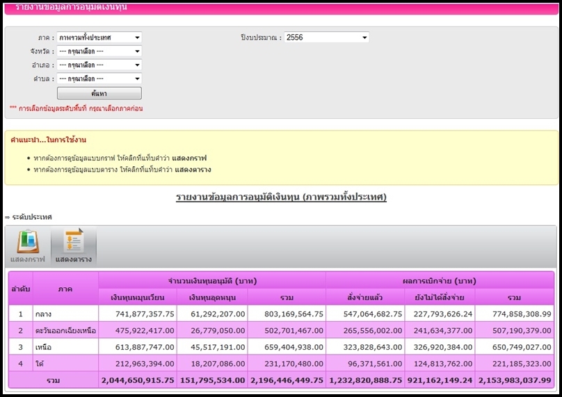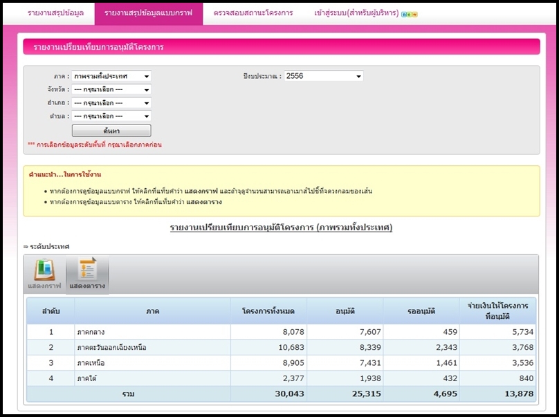ซึ่งไม่แตกต่างจากรายงานข้อมูลการอนุมัติเงินทุน ภาพรวมทั้งประเทศ ที่สัดส่วนจำนวนเงินที่อนุมัติตกอยู่ที่ภาคกลาง ตะวันออกเฉียงเหนือ เหนือ และใต้ ตามลำดับ