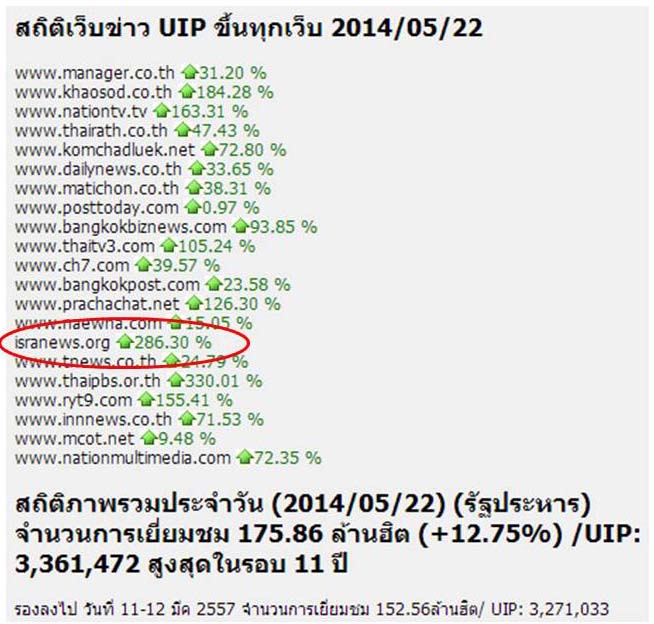 สถิติการใช้งานเว็บไซต์ข่าวของคนไทยเพิ่มขึ้นกระฉูดหลังการตัดสัญญาณถ่ายทอดโทรทัศน์และวิทยุตั้งแต่ช่วงเวลา 16.30 น. ของวันที่ 22 พฤษภาคม 2557 โดยคณะรักษาความสงบแห่งชาติหรือ คสช. ที่ประกาศยึดอำนาจแบบเบ็ดเสร็จ
