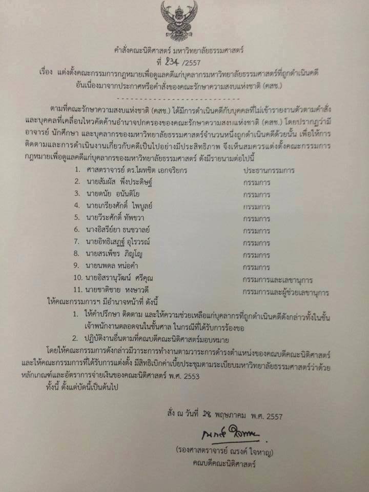 นิติฯมธ.ตั้งกก.กฎหมายดูแลบุคลากรถูก คสช.ดำเนินคดี