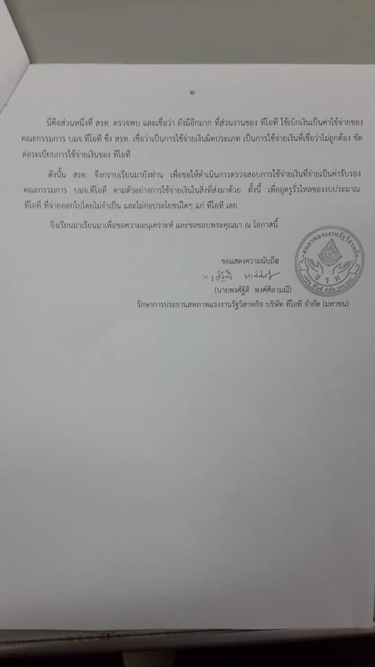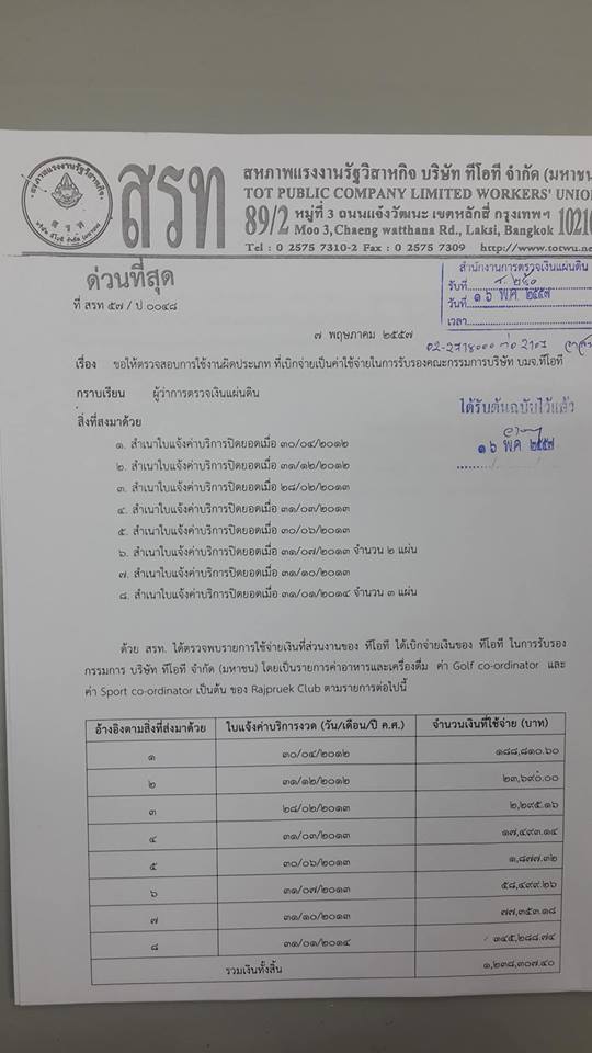 เป็นหนังสือที่สหภาพแรงงานรัฐวิสาหกิจ ( สรท. ) บริษัท ทีโอที จำกัด มหาชน ได้ทำถึงผู้ว่าการตรวจเงินแผ่นดิน สำนักงานการตรวจเงินแผ่นดิน ( สตง. ) เรื่อง ขอให้ตรวจสอบการใช้งานผิดประเภท ที่เบิกจ่ายเป็นค่าใช้จ่าย ในการรับรองคณะกรรมการบริษัท บมจ.ทีโอที หนังสือฉบับนี้ ลงวันที่ 7 พฤษภาคม 2557 และสำนักงานการตรวจเงินแผ่นดิน รับเรื่องไว้แล้ว ลงตราประทับวันที่ 16 พฤษภาคม 2557
