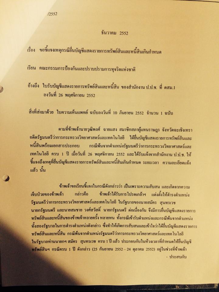 "ข้าพเจ้าขอเรียนชี้แจงในกรณีดังกล่าวว่า เป็นเพราะความสับสน และเกิดจากความเจ็บป่วยของข้าพเจ้า กล่าวคือ ข้าพเจ้าได้รับการโปรดเกล้าฯ แต่งตั้งให้ดำรงตำแหน่ง รมว.กระทรวงวิทยาศาสตร์ฯ ในรัฐบาลของนายสมัคร สุนทรเวช นายกรัฐมนตรีและนายสมชาย วงศ์สวัสดิ์ นายกรัฐมนตรี ต่อเนื่องกัน จึงมีการยื่นบัญชีแสดงรายการทรัพย์สินและหนี้สินของข้าพเจ้าหลายครั้งหลายหน ทั้งกรณีเข้ารับตำแหน่งและกรณีพ้นจากตำแหน่งทั้งสองรัฐบาลในการดำรงตำแหน่งดังกล่าว ซึ่งทำให้เกิดการสับสนและเข้าใจว่าได้ยื่นบัญชีแสดงรายการทรัพย์สินและหนี้สิน กรณีพ้นตำแหน่งรัฐมนตรีว่าการกระทรวงวิทยาศาสตร์ฯ ในรัฐบาลท่านนายกฯสมัคร สุนทรเวช ครบ 1 ปีแล้ว"