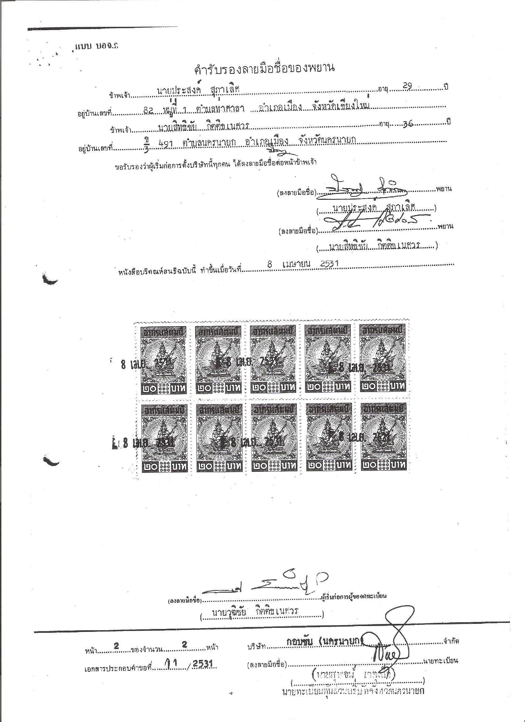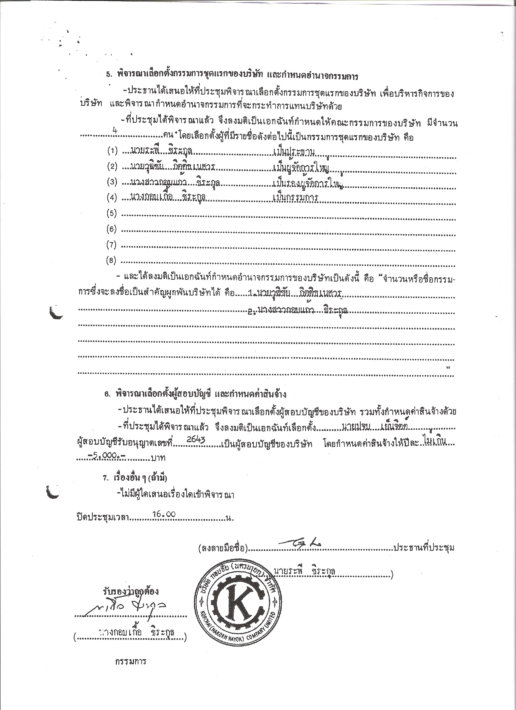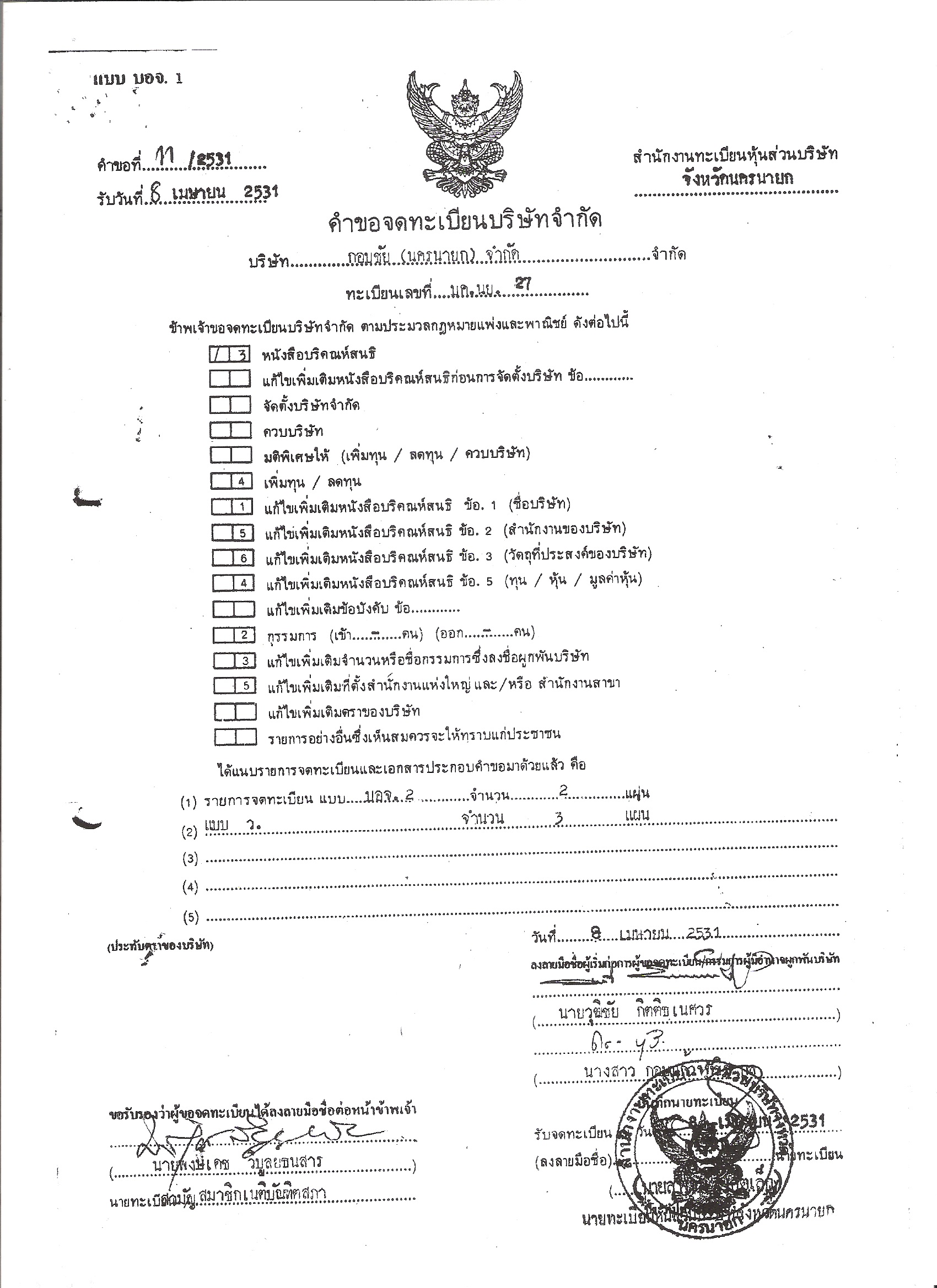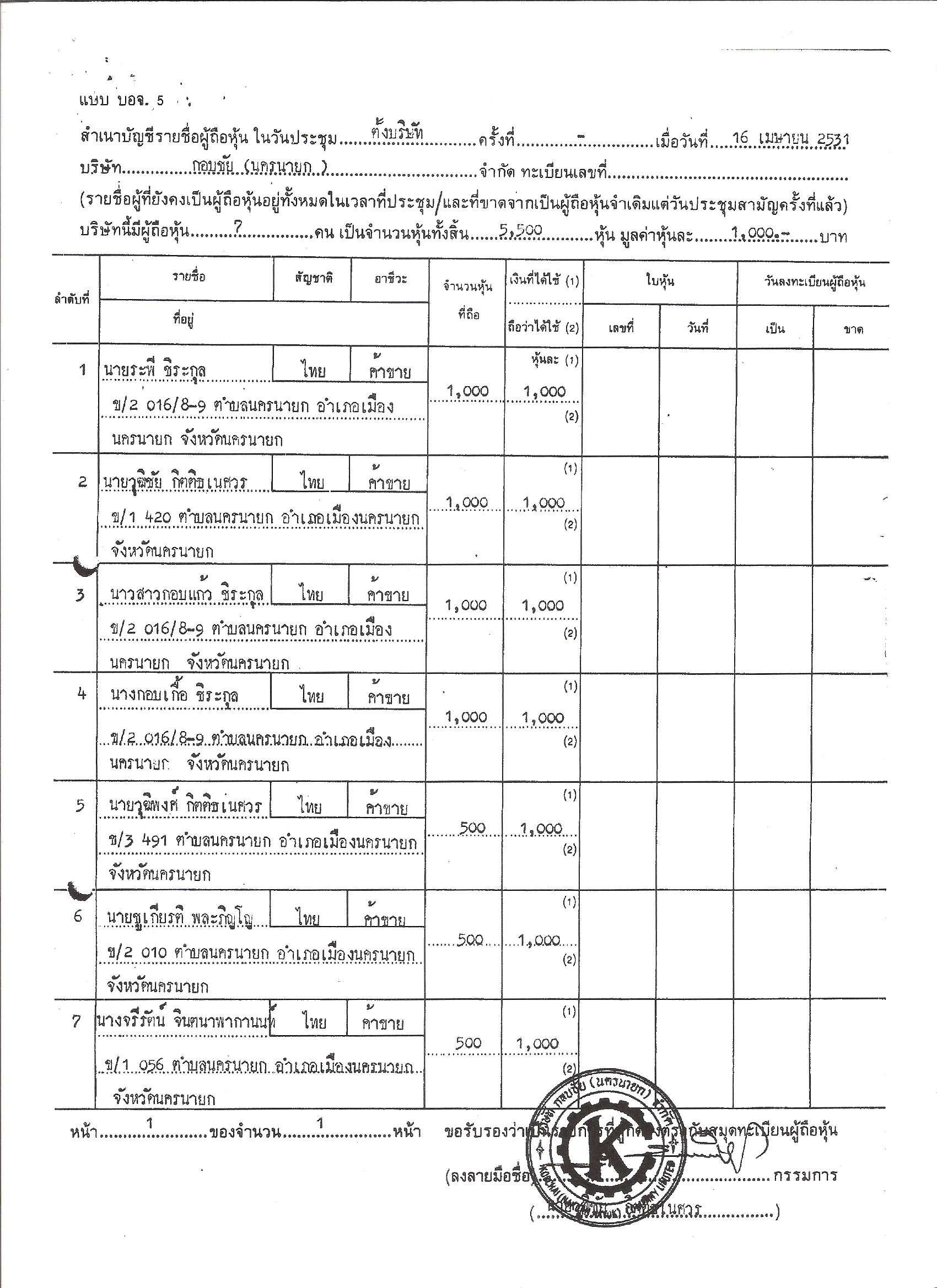 1.นายระพี ชิระกุล 1,000 หุ้น (พ่อภรรยานายวุฒิชัย) 2.นายวุฒิชัย กิตติธเนศวร 1,000 หุ้น 3.น.ส.กอบแก้ว ชิระกุล 1,000 หุ้น (ภรรยานายวุฒิชัย) 4.นางกอบเกื้อ ชิระกุล 1,000 หุ้น (แม่ภรรยานายวุฒิชัย) นายวุฒิพงศ์ กิตติธเนศวร 500 หุ้น นายชูเกียรติ พละภิญโญ 500 หุ้น นางจรีรัตน์ จินตนาพากานนท์ 500 หุ้น รวม 5,500 หุ้น มูลค่าหุ้นละ 1,000 บาท มีนายวุฒิชัย เป็นกรรมการ ในขั้นตอนการ จดทะเบียนก่อตั้ง มีนายประสงค์ สุภาเลิศ และนายสิทธิชัย กิตติธเนศวร เป็นพยาน