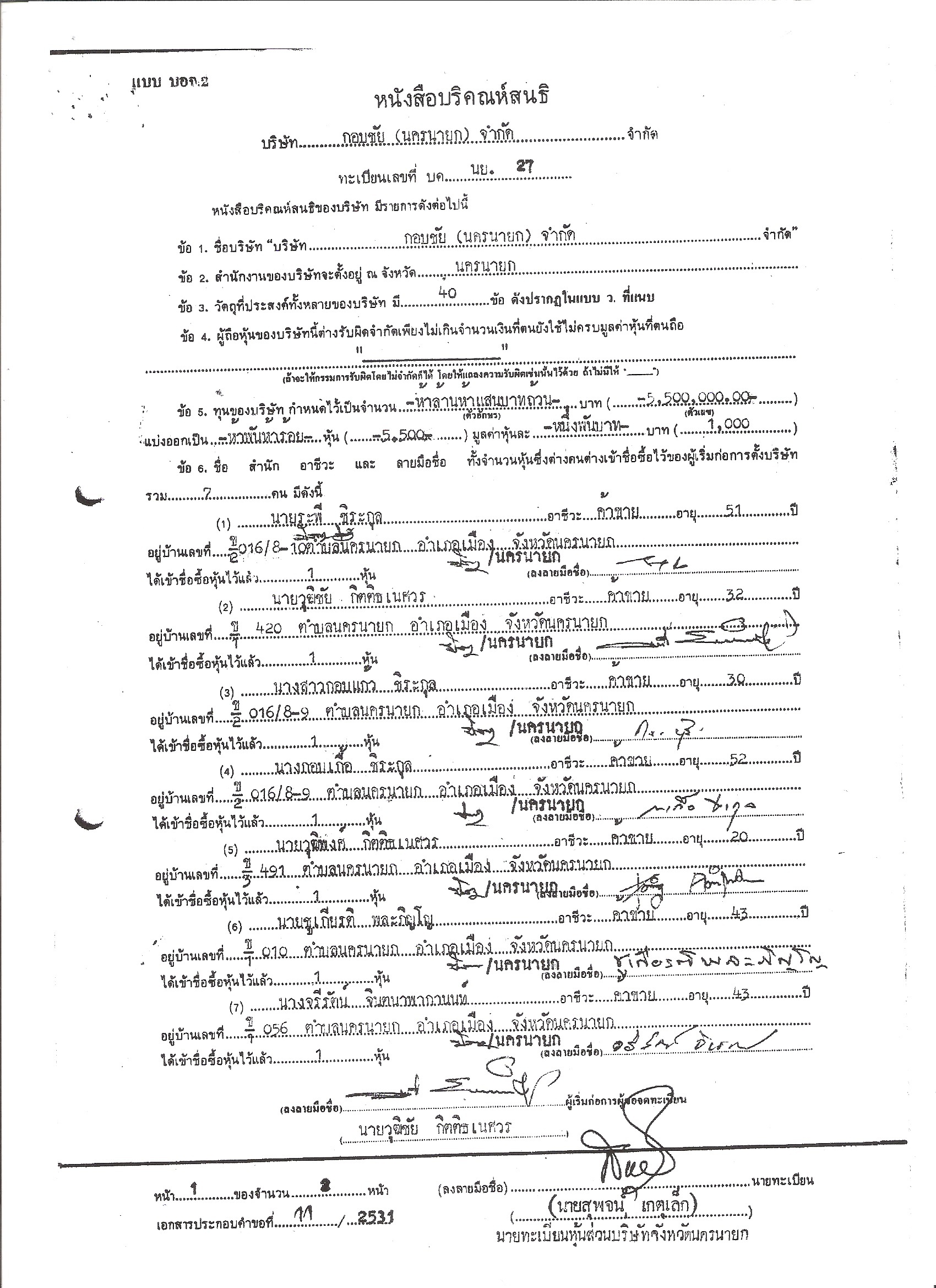 ทั้งนี้ บริษัท กอบชัย (นครนายก) จำกัด จดทะเบียนก่อตั้งเมื่อวันที่ 8 เมษายน 2531 ทุน 5,500,000 บาท ทุนปัจจุบัน 60.5 ล้านบาท ที่ตั้งเลขที่ 267/5 ถนนสุวรรณศร ตำบลนครนายก อำเภอเมืองนครนายก จังหวัดนครนายก นายวุฒิชัย กิตติธเนศวร เป็นผู้ก่อตั้ง ผู้ถือหุ้น 7 คน