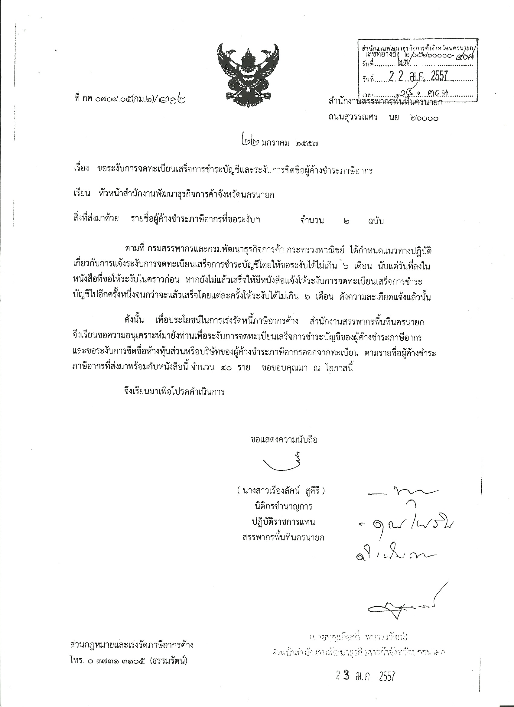 ทั้งนี้ กรณีของห้างหุ้นส่วนจำกัดวิศิษฎ์ชัยนั้น น.ส.เรืองลัคน์ สูคีรี นิติกรชำนาญการ ปฏิบัติราชการแทนสรรพากรพื้นที่นครนายก ได้ทำหนังสือที่ กค. 0709 .05 (กม.2) /312 ลงวันที่ 22 ม.ค.57 ระบุนิติบุคคลจำนวน 40 ราย ค้างชำระภาษี