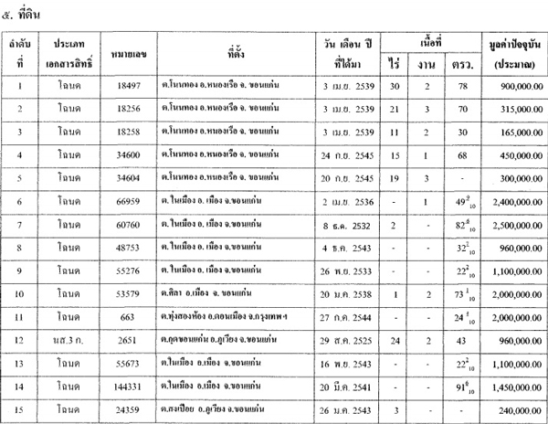 แจ้งกับคณะกรรมการ ป.ป.ช. กรณีพ้นจากตำแหน่งครบ 1 ปี เมื่อวันที่ 27 ตุลาคม 2556 ระบุว่า ครอบครองที่ดินทั้งสิ้น 15 แปลง (รวมของคู่สมรส) มี 14 แปลงอยู่ในจังหวัดขอนแก่น 1 แปลงในกรุงเทพฯ