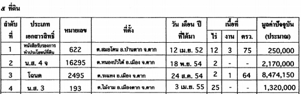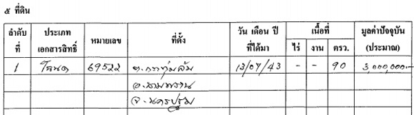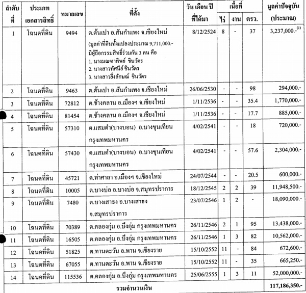 พบว่า นายนิวัฒน์ธำรง ครอบครองที่ดินเยอะที่สุด (รวมของคู่สมรส) 15 แปลง 23 ล้านบาท เท่ากับนายภูมิ (รวมของคู่สมรส) 15 แปลง 16 ล้านบาท รองลงมาเป็นน.ส.ยิ่งลักษณ์ 14 แปลง 117 ล้านบาท นายบุญทรง 4 แปลง (เป็นของคู่สมรส) 12 ล้านบาท และนายยรรยง ครอบครองที่ดินน้อยที่สุดเพียง 1 แปลง 3 ล้านบาท