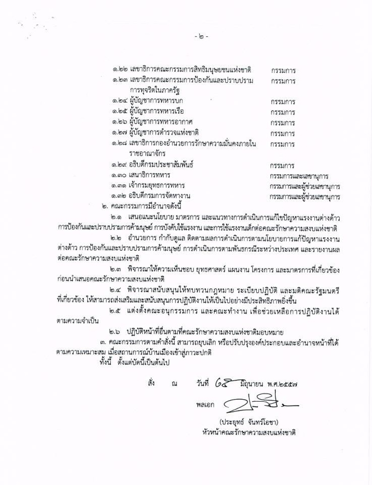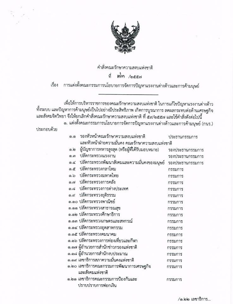 เรื่อง การแต่งตั้งคณะกรรมการนโยบายการจัดการปัญหาแรงงานต่างด้าวและการค้ามนุษย์