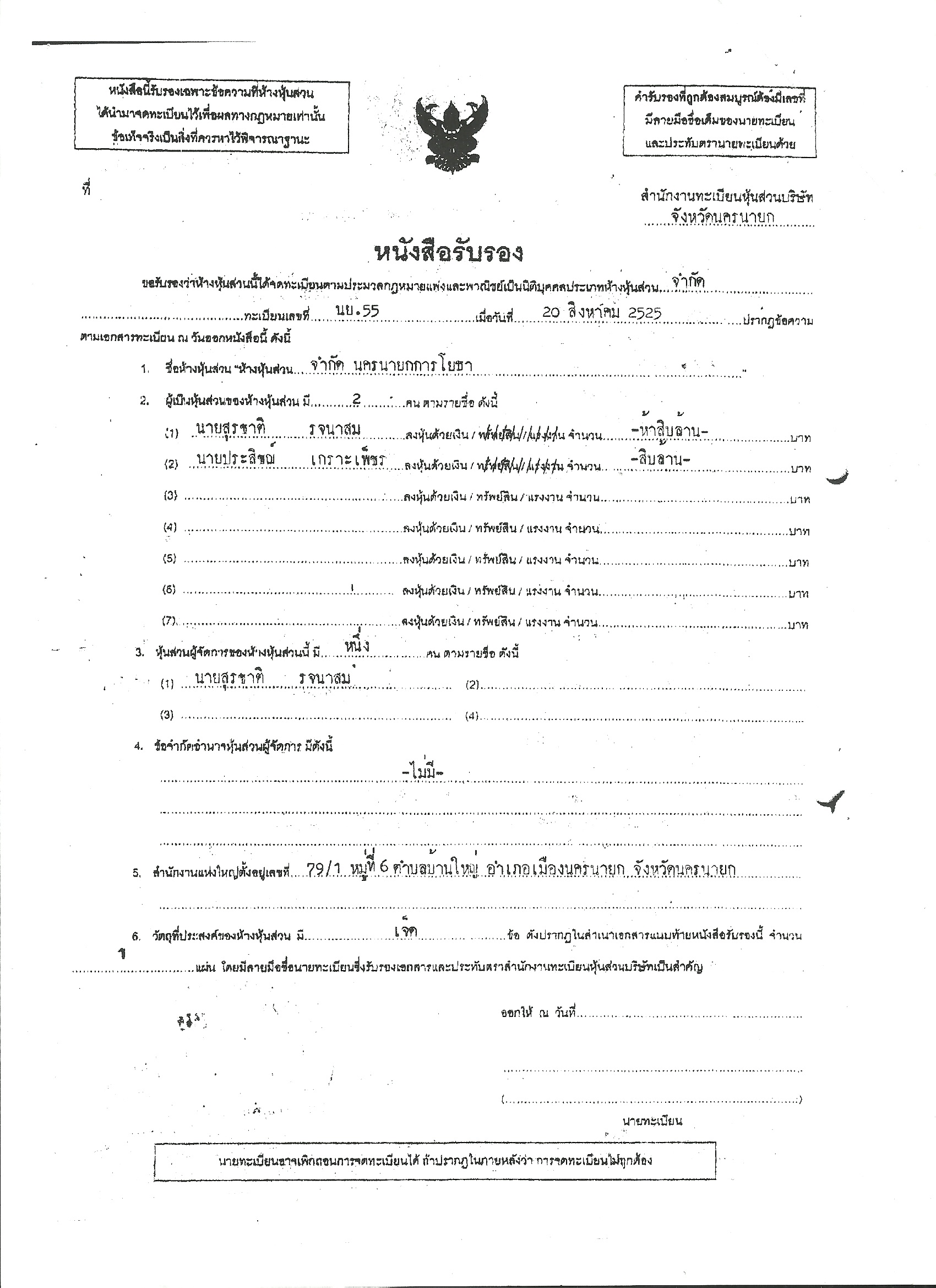 2.ห้างหุ้นส่วนนครนายกการโยธา นายสิทธิชัยโอนเงินลงทุนมูลค่า 1,500,000 บาท (ขณะที่หจก.นครนายกการโยธา มีทุน จดทะเบียน 3 ล้านบาท) ให้นายประสิชฌ์ เกราะเพ็ชร เมื่อวันที่ 5 มี.ค.2536