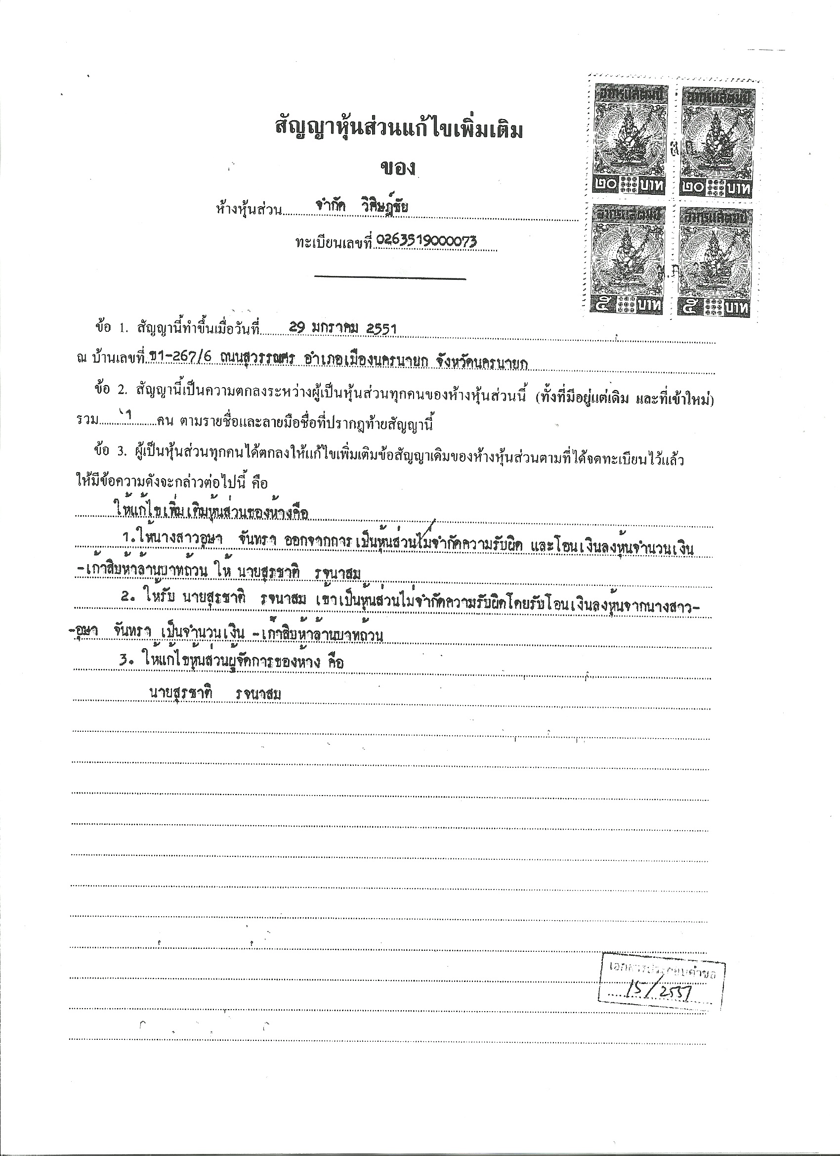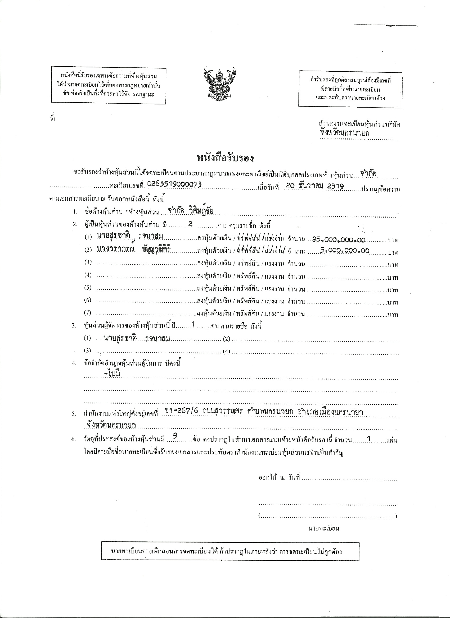 จากการตรวจสอบพบว่าการโอนเงินลงทุน วิศิษฎ์ชัย ระหว่าง น.ส.อุษา จันทรา กับ นายสุรชาติ รจนาสม ได้จดทะเบียนต่อสำนักงานทะเบียนหุ้นส่วนบริษัทจังหวัดนครนายกเมื่อวันที่ 29 ม.ค.51 (ดูเอกสารประกอบ)