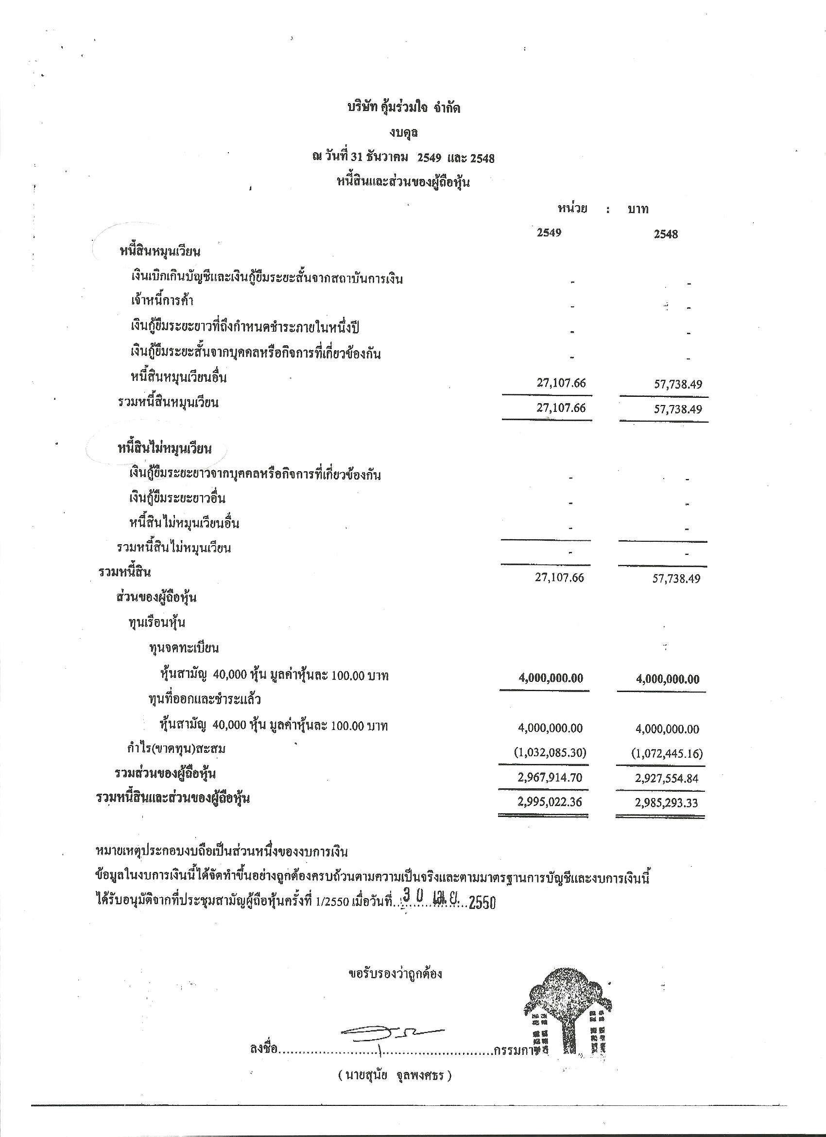 ในงบดุลปี 2549 ระบุว่ามีหนี้สินเพียงรายการเดียวเช่นกันคือ หนี้สินหมุนเวียนอื่น จำนวน 27,107.66 บาท ไม่ได้ระบุว่ามีเงินกู้ยืมระยะยาวจากบุคคลหรือกิจการที่เกี่ยวข้องกัน
